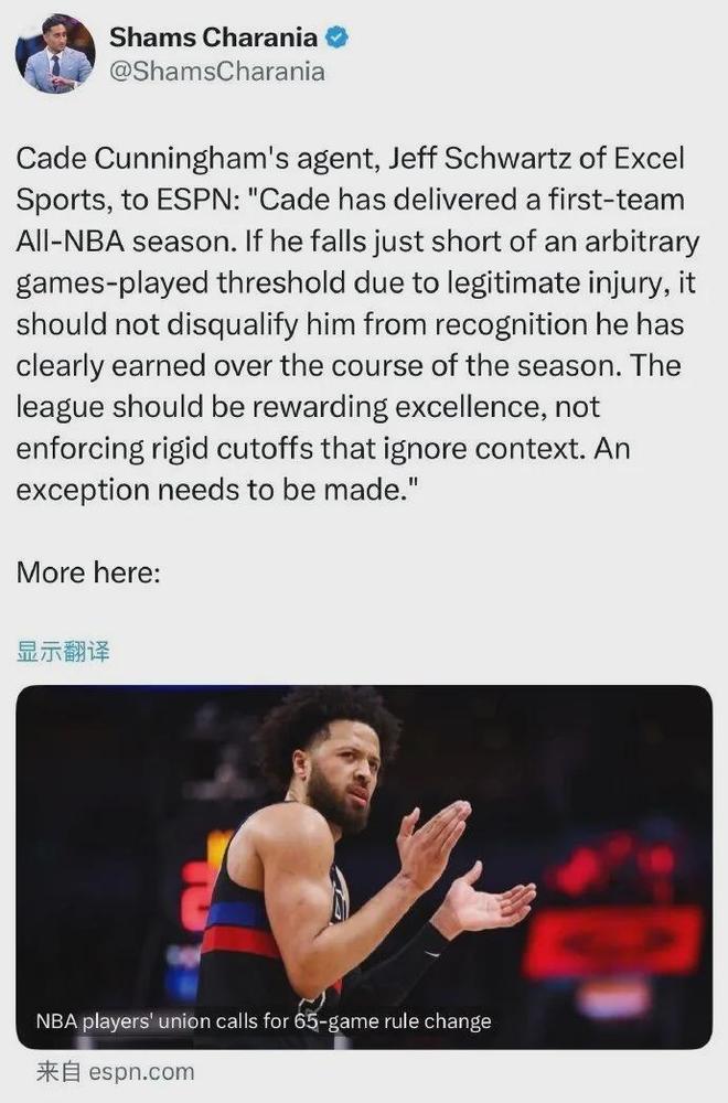 据悉坎宁安团队正在跟NBA联盟申请开绿灯,允许坎宁安也能参与进MVP和最佳阵容等各大重磅奖项评选行列。