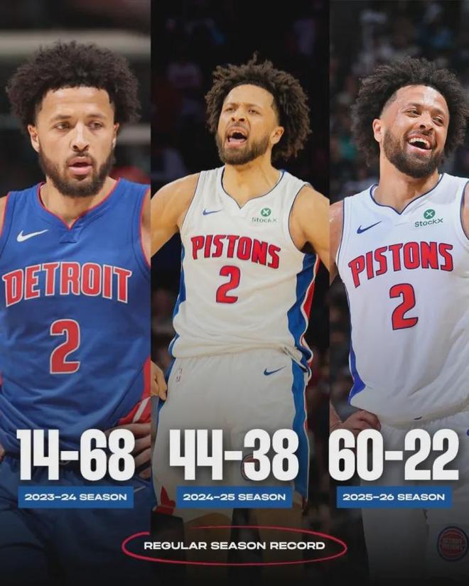 23-24赛季14胜68负;24-25赛季44胜38负;25-26赛季60胜22负。